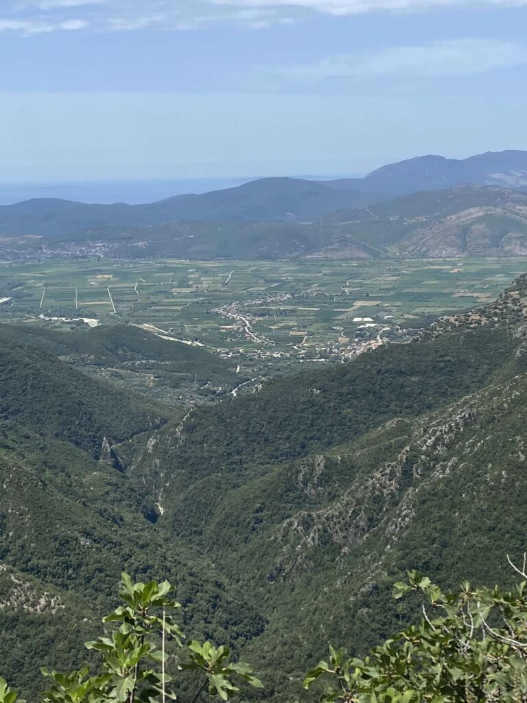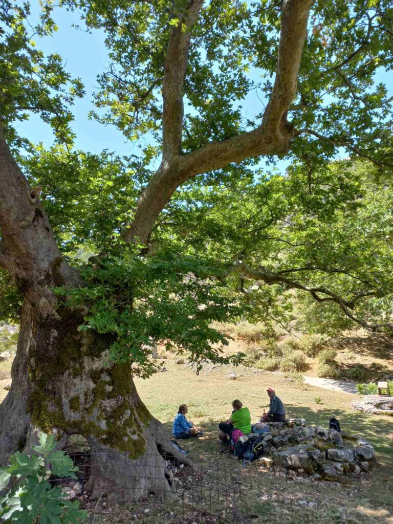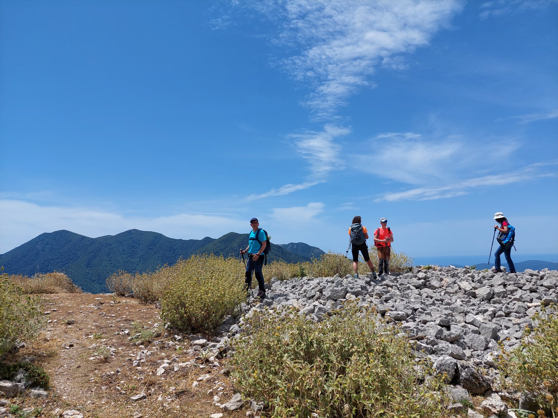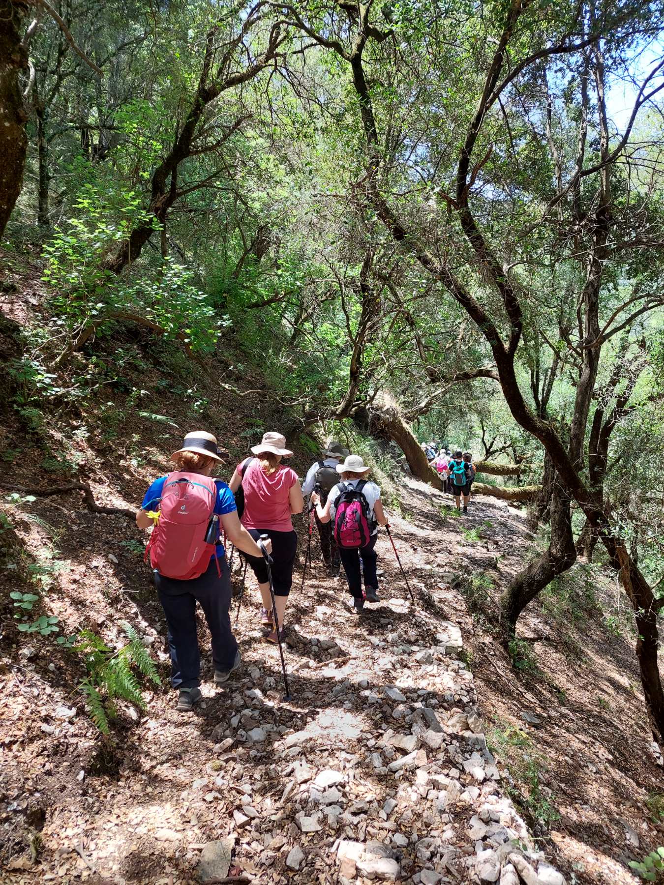 Κατεβαίνοντας μπήκαμε σε μονοπάτι, πετρώδες, με κάποια σκαλιά να σώζονται ακόμη, η βλάστηση χαμηλή και δενδρώδης από βελανιδιές και πολλά αρωματικά βότανα.