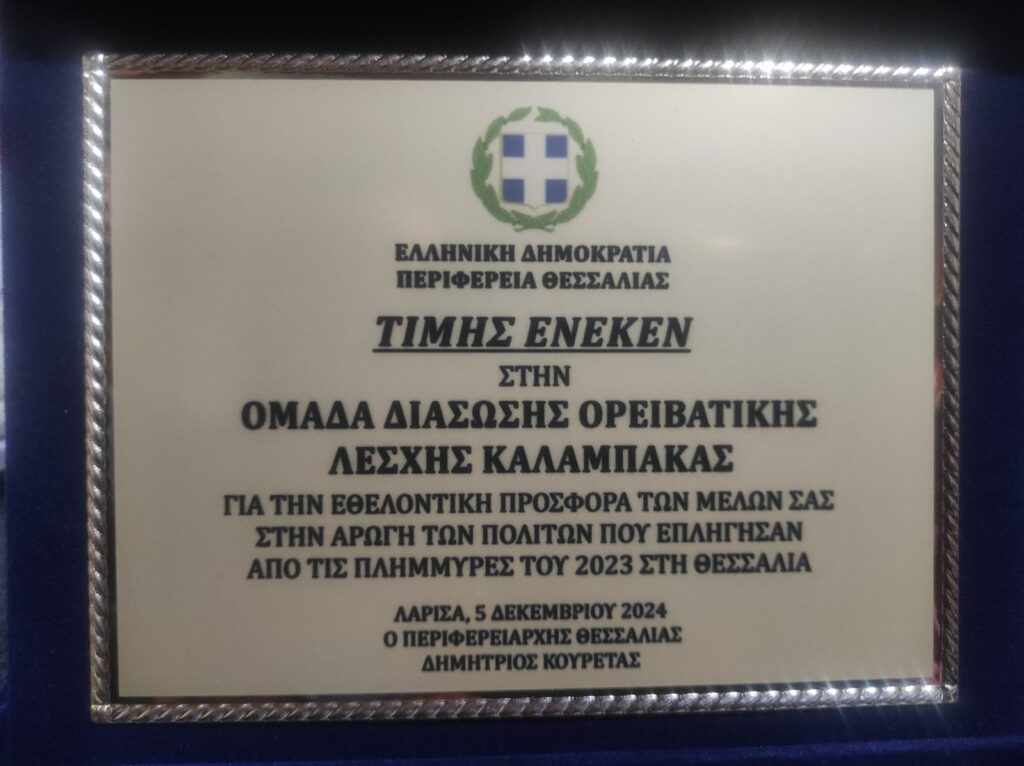 Την Πέμπτη 5 Δεκεμβρίου ημέρα εθελοντισμού, η Ομάδα Διάσωσης της Ορειβατικής Λέσχης Καλαμπάκας τιμήθηκε όπως και άλλες εθελοντικές ομάδες από την Περιφέρεια Θεσσαλίας για τη σημαντική συνεισφορά της στους πληγέντες κατά τη διάρκεια των καταστροφικών πλημμυρών του 2023.